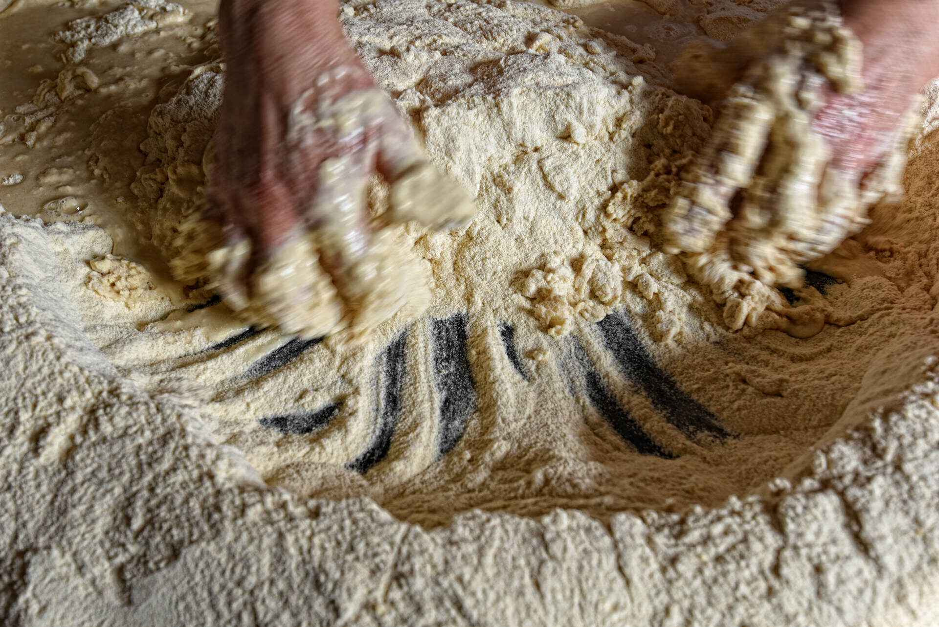 Disponete la farina a fontana sul piano di lavoro e versate al centro il lievito, il sale e l’acqua. Impastate velocemente e poi “scanate” (spianate) con le braccia per ottenere un impasto di una consistenza media (non deve essere troppo morbido).